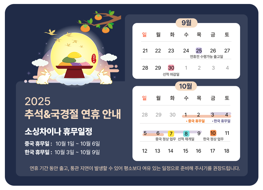 2025년 소싱차이나 추석&국경절 휴무 안내입니다.