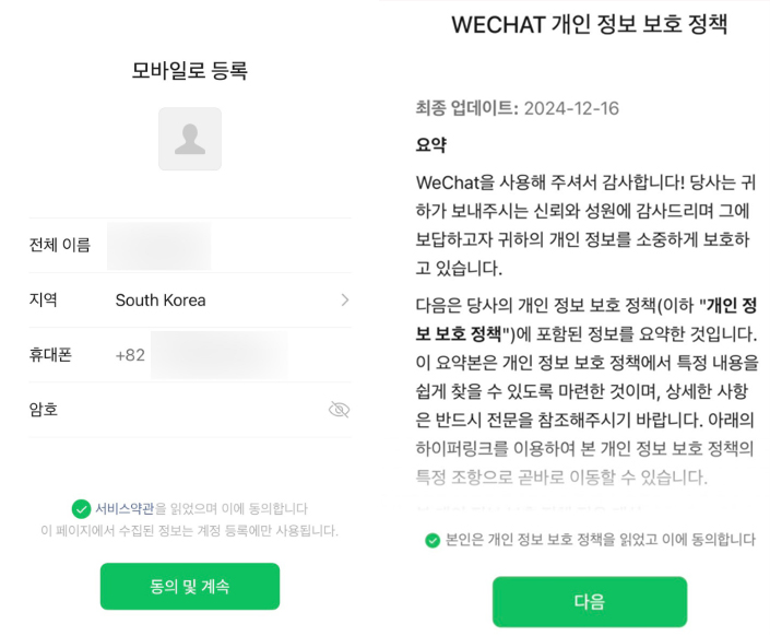 이름/지역/휴대폰/암호 순서대로 입력> 동의 및 계속