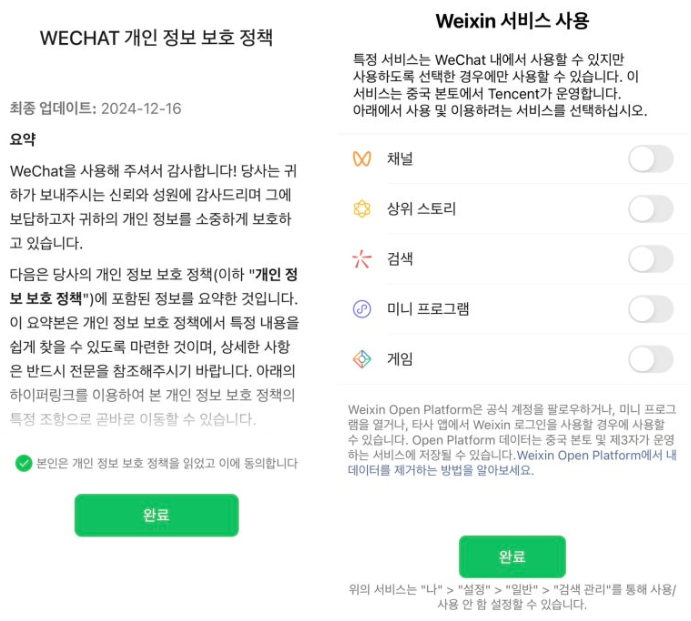 Weixin 서비스는 체크하지 않고 완료 눌러주셔도 됩니다.