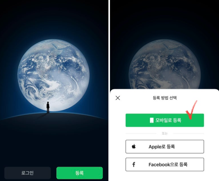 오른쪽 상단 언어>한국어로 바꿔서, ‘모바일등록’ 선택해주세요.
